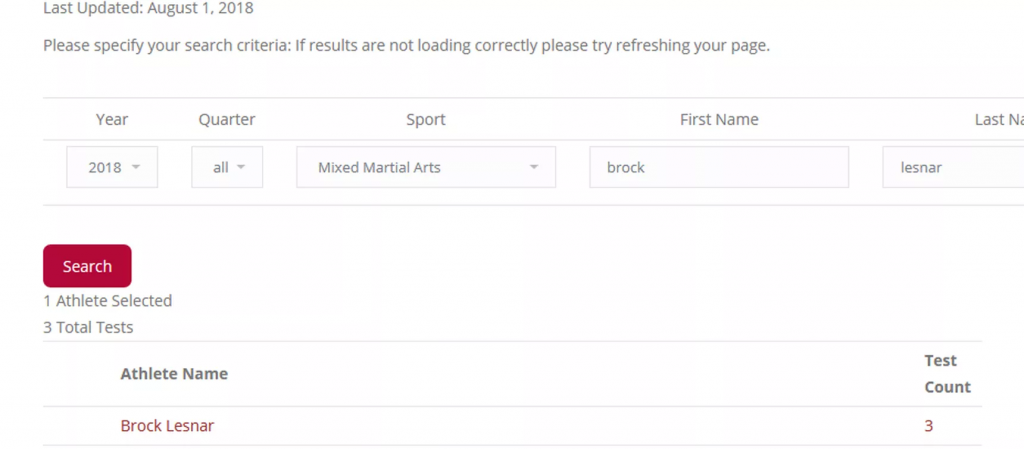 In an update, since August 1st, it appears as though Brock has not had to submit any samples for testing. The latest update on the USADA website was for August 22nd, and still only shows Lesnar being tested three times.