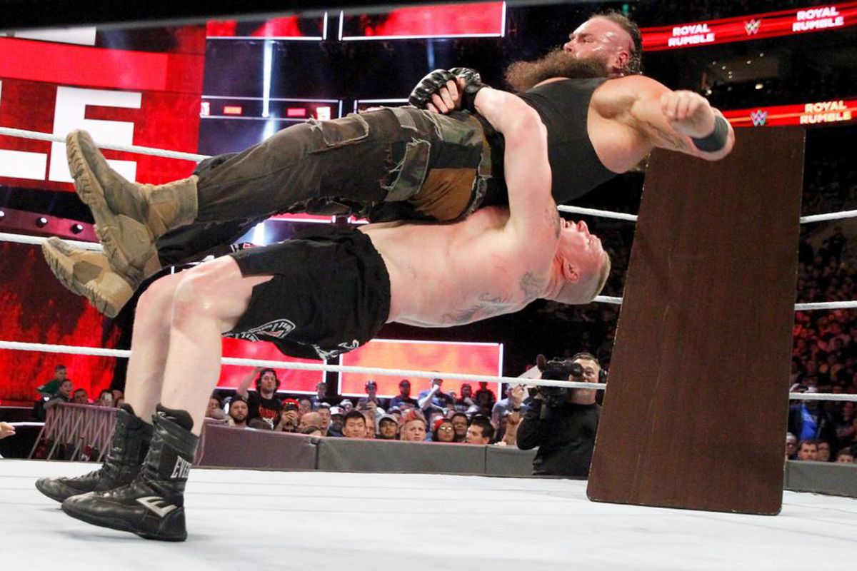 During the Universal Title match between Brock Lesnar, Braun Strowman, and Kane at this past Sunday’s 2018 Royal Rumble PPV, there was a moment during the match when Braun connected with a stiff knee to the side of Brock Lesnar’s head; resulting in Brock to immediately fire back with two heavy right hands to the face of Strowman.