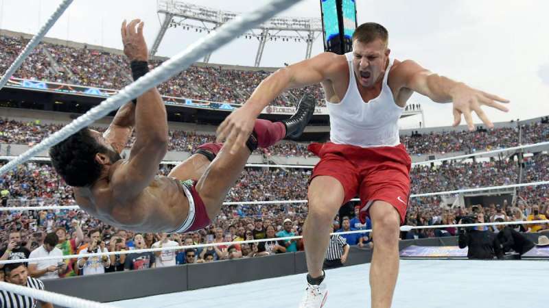 As you may know, Gronkowski appeared at WrestleMania 33 last year helping his buddy Mojo Rawley win the Andre The Giant Memorial Battle Royal.