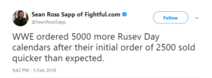 On Monday of this week, Fightful.com Managing Editor Sean Ross Sapp broke the news that WWE ordered 5,000 more Rusev Day calendars, after their initial order of 2,500 sold quicker than expected.