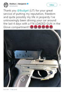 After renting a car at Budget, Benjamin found a ‘fully loaded’ firearm in the glove compartment of his rental car. Benjamin shared his experience on Twitter, calling out Budget.
