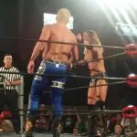 Lethal making the comeback now. Lethal with a flying elbow, into a pinfall attempt but kick out at two from Gresham. Lethal locks in the Figure Four Leglock in North Carolina. Crowd loves it. Lots of “woooo’s” and assorted attempts at Flair chant’s around me but none gained any traction. Lethal still has the figure four locked in, Gresham trying to escape. He can’t do it. He can’t hold on any longer, he has to tap.