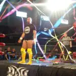 On the outside Cody tosses Vinnie over the guard rail into the crowd. Marseglia lands in the section just to my left. Lots of stuff going on all over the place again. TK catches Cody with a big right hand, here comes Scurll to retaliate laying out O’Ryan, but Marty gets caught with a nice bicycle kick from Marseglia who I didn’t even see make his way back from the crowd. Hangman takes out Vinnie with a vicious clothesline. But here comes Taven dropping Page immediately following the clothesline. Cody on Taven now, he locks in the American Deathlock, but Taven endures and makes it to the ropes breaking the hold.