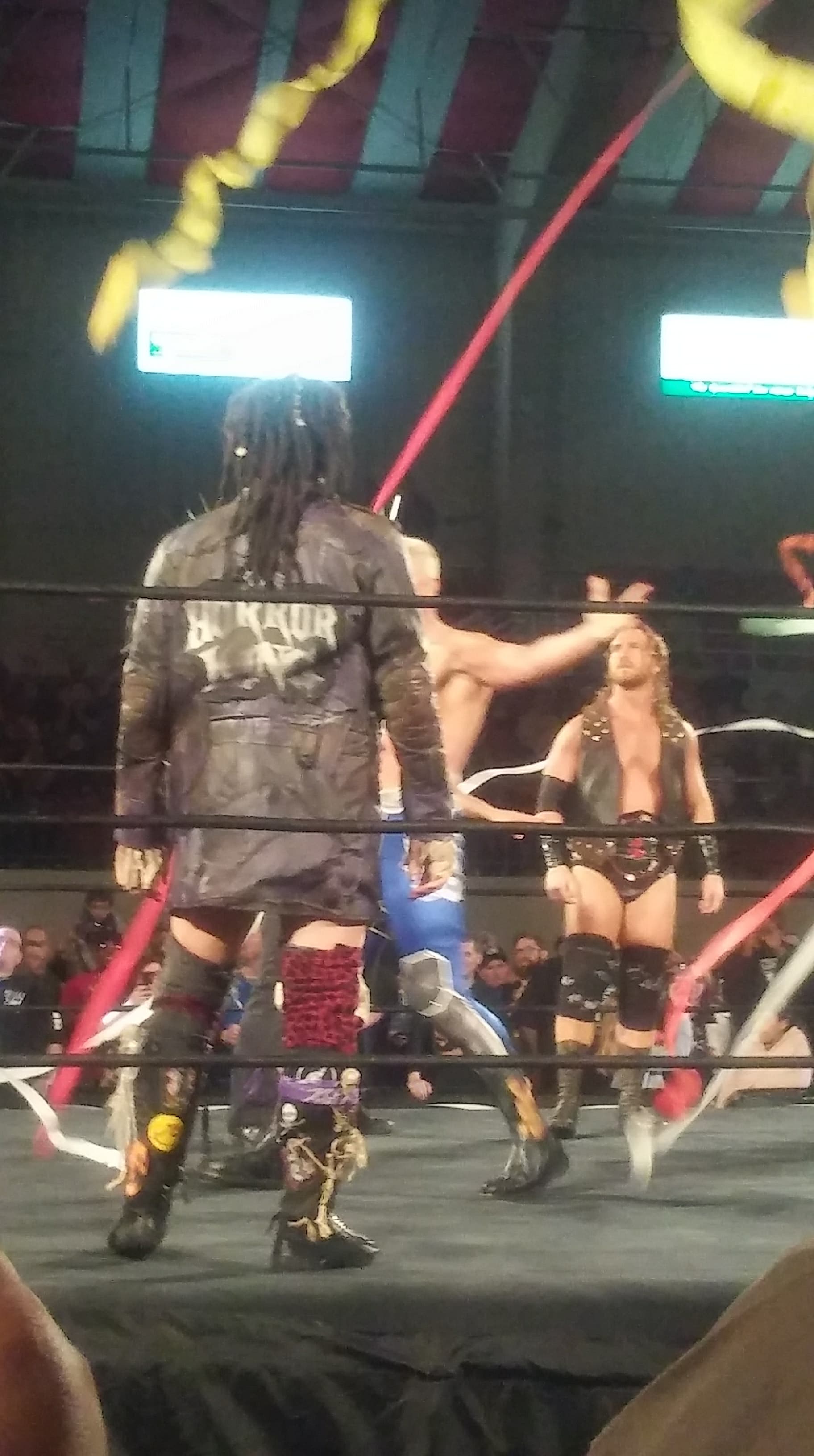 Jackson locks in a running bulldog on one of The Best Friends, all while clotheslining the other member. I lost track of who was legal and who was on the receiving end of what. Bucks going for a double team move now. Looks like a powerbomb/superkick combo or maybe the Meltzer Driver I couldn’t tell, I was busy being rowdy and heckling and cheering and being that guy in the crowd at this point. But it doesn’t matter because I’ll never know since Matt’s back gave out, selling the injury that they worked over earlier in the match.