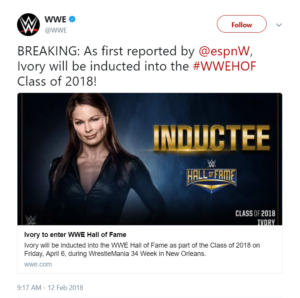 “Ivory, a true pioneer in women’s wrestling, will take her place in the WWE Hall of Fame on Friday, April 6, during WrestleMania 34 Week in New Orleans, as a member of the Class of 2018. The news was first reported by ESPN.
