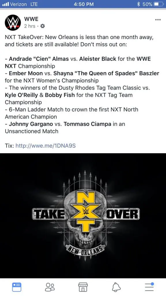 Somebody in WWE’s Marketing Department who runs their official Facebook page made a huge screw up and accidentally leaked the complete card for NXT TakeOver: New Orleans event during WrestleMania weekend.