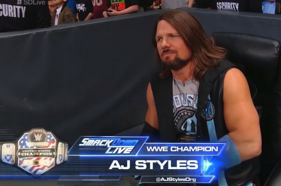 AJ Styles came out for commentary during the Rusev vs. Shinsuke Nakamura match. When introducing AJ who was sitting at the announce table, WWE botched the graphic which showed the United States Title next to WWE Champion AJ Styles name.