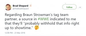 Regarding Braun Strowman’s tag team partner, a source in #WWE indicated to me that they'll “probably withhold that info right up to showtime.” 🤔