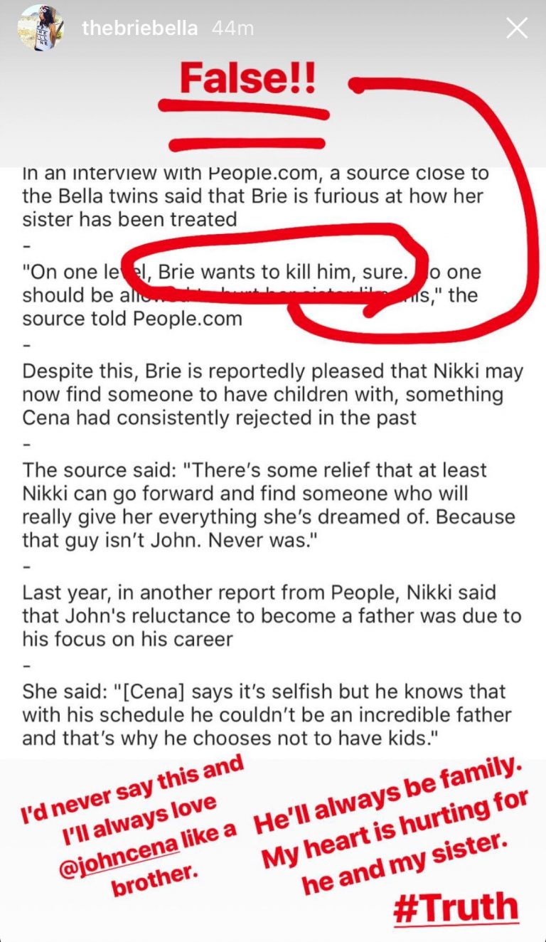 Brie went on to say that she will always love John Cena like a brother, and her heart is hurting for both her sister Nikki, and John Cena during this difficult time.