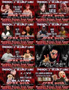 Unholy Warfare “Til Death Do Us Part” brings death match rivalries on June 30 at the National Guard Armory, 292 N Highway 65, Reidsville, NC. VIP seating at 6 p.m., bell time 7 p.m.