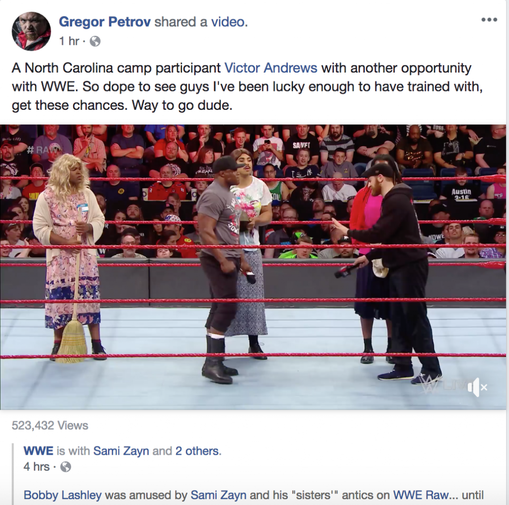 You can see a Facebook post from Andrews thanking everyone for for their well wishes, he joked that it was his “twin cousin” V, embedded below along with one of the many posts from fans congratulating him on his appearance on RAW.