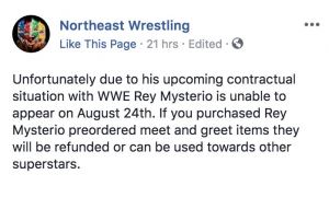 Independent wrestling promotion Northeast Wrestling has been advertising Rey Mysterio to appear on their upcoming Wrestling Under The Stars event on August 24th in Pittsfield, MA. Well, NEW has posted an update on their facebook page offering refunds to fans because Rey Mysterio will no longer be able to appear at the event “due to his upcoming contractual situation with WWE”.