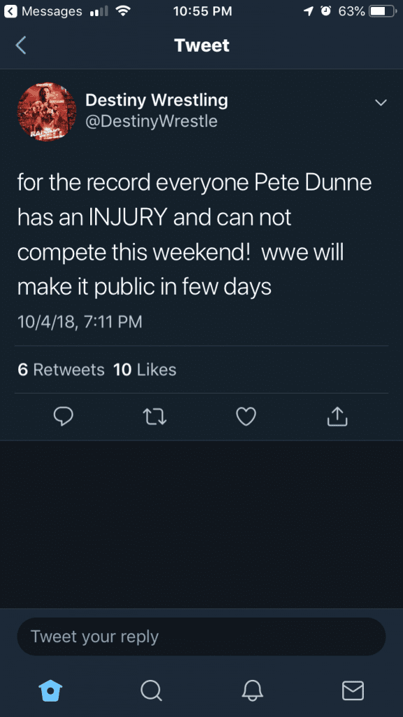 Below you can see a screen grab of the tweet from Destiny Wrestling revealing the injury to Pete Dunne, which has since been deleted, below.
