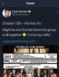 Cody Rhodes posted a tweet earlier, which has since been deleted, advertising an event on October 13th in Monroe, New Jersey which will feature himself, Brandi Rhdoes, The Young Bucks, Marty Scurll, and Hangman Page. Cody posted the event poster, and the message “Might be one of the last times the group is all together 😢 Come say hello!”