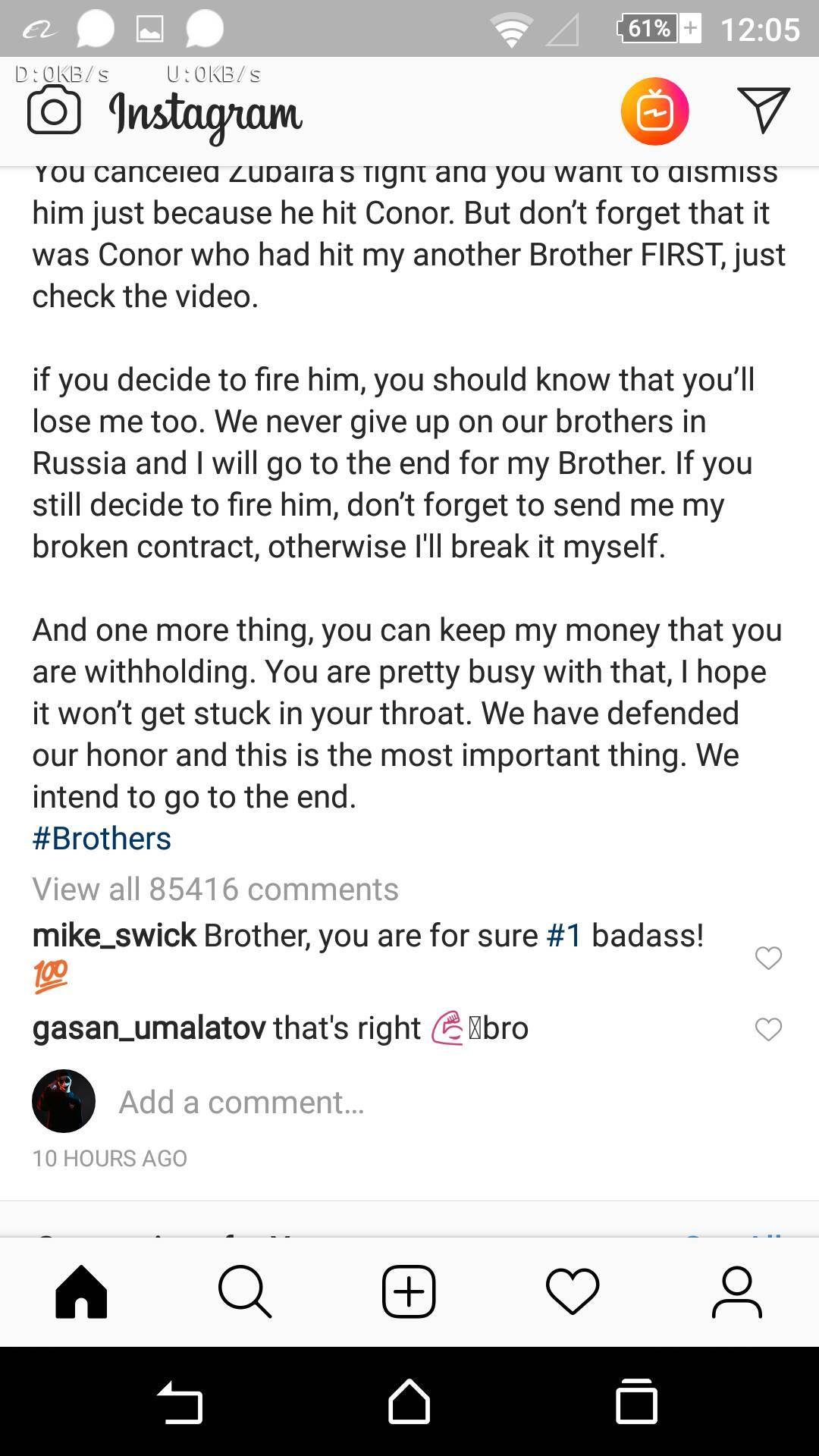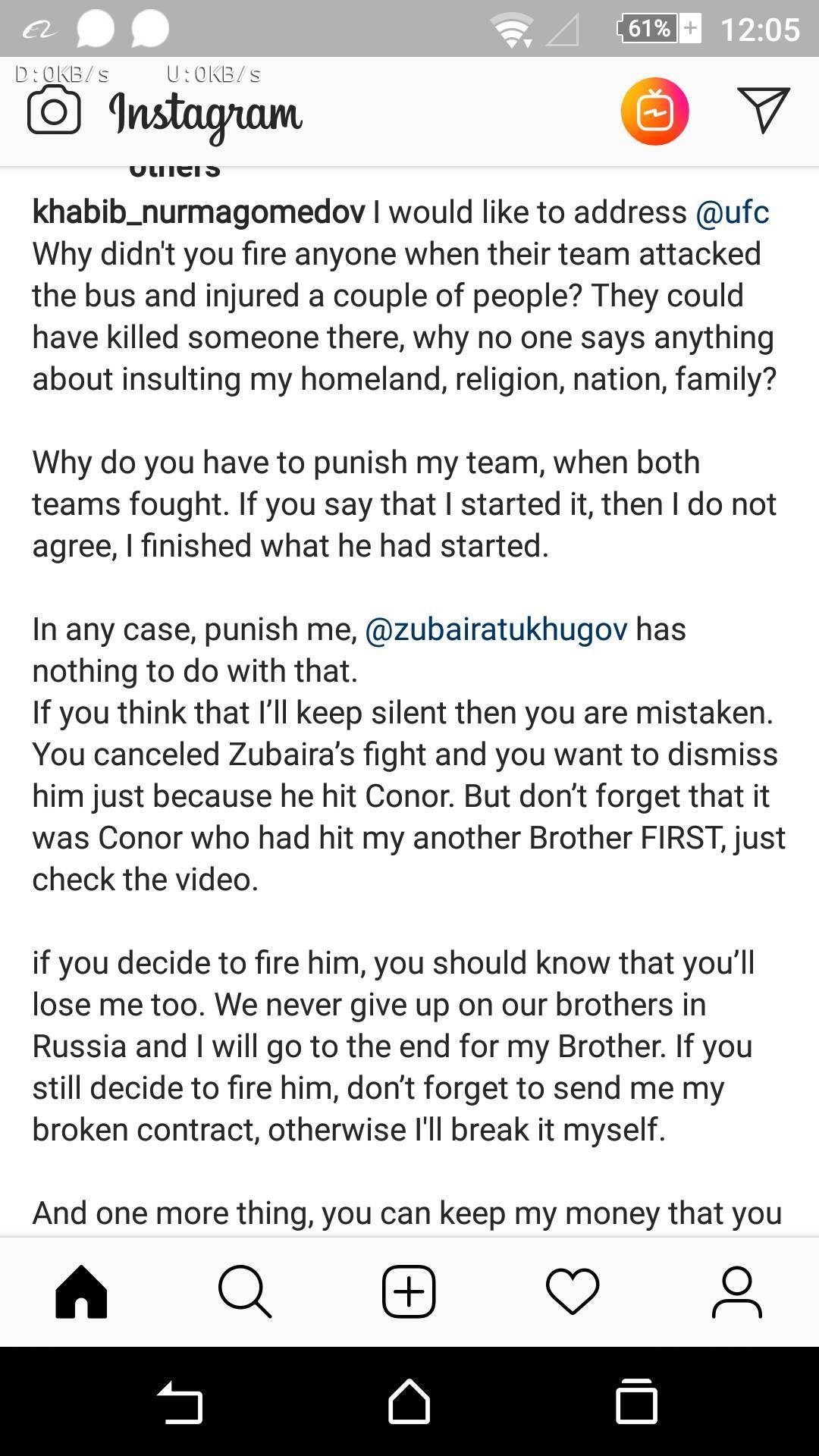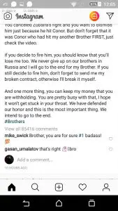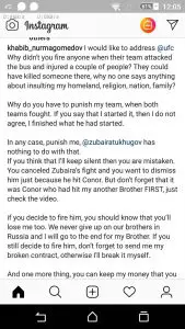 In any case, punish me, @zubairatukhugov has nothing to do with that. If you think that I’ll keep silent then you are mistaken. You canceled Zubaira’s fight and you want to dismiss him just because he hit Conor. But don’t forget that it was Conor who had hit my another Brother FIRST, just check the video.