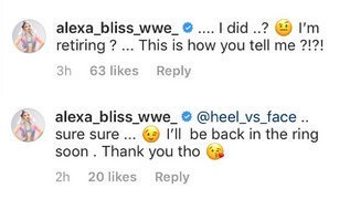 Alexa Bliss was recently asked on instagram about the rumors of her possible retirement, to which she replied by saying, “I did? I’m retiring? This is how you tell me?!” Alexa followed that up by saying “sure sure.. I’lll be back in the ring soon. Thank you tho.”