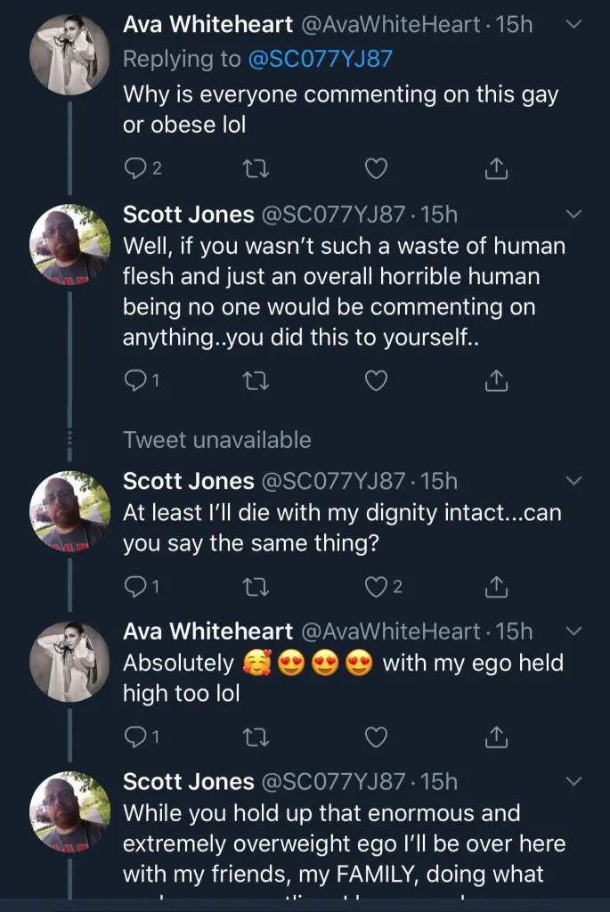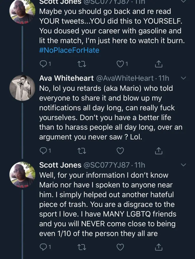 In response to a Facebook post Ava replied by simply calling the person a “fag”. This started a whole slew of comments, some highlights include her saying “I can’t wait for you to die of aids”, and even calling a fan a “retard” when clarifying that she wasn’t a model she was a wrestler.