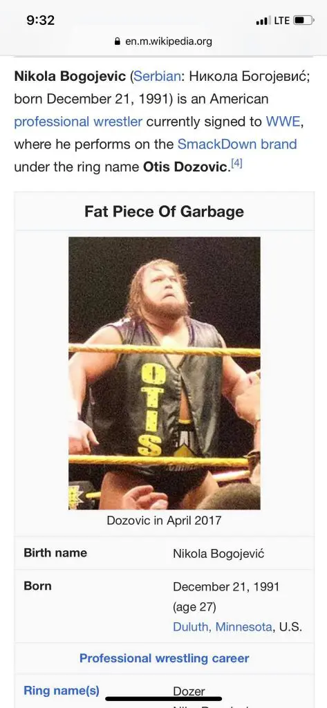 A funny photo has been circulating online showing Dozovic’s wikipedia page, which showed a very noticeable and humorous edit a fan had apparently made to his page. Where normally the wiki page would display the subjects name above their photo, a fan had changed “Otis Dozovic” to instead read “Fat Piece Of Garbage”.