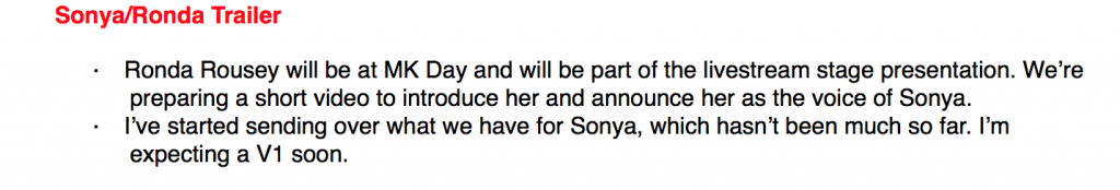 Special Sonya Blade/Ronda Rousey video packages are also being prepared and will be aired as part of the presentation. One video will be a game hype trailer, the other will be Confirming Sonya Blade and introducing Ronda Rousey.