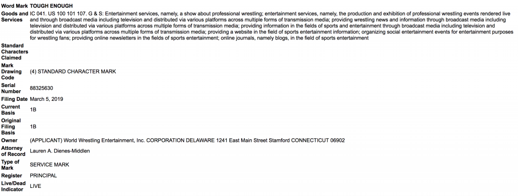 The description for WWE’s filed trademark for “Tough Enough” with the United States Patent and Trademark Office reads: