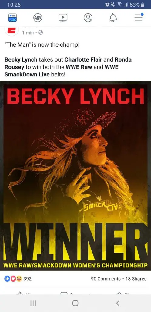Instead of posting a picture of The Man Becky Lynch being the dual champion, ESPN posted a picture of Carmella.