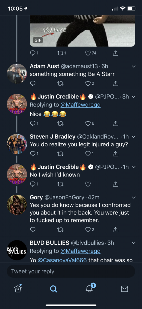 Maffew from Botchamania shared a GIF of Justin Credible throwing a chair into the battle royal. That started off a chain of replies that unearthed the fact that Credible was seemingly on drugs/drunk and the chair that was thrown sent independent wrestler Gory to the ER.