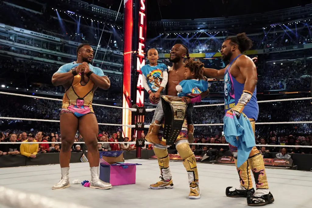 Fireworks shot off and entire stadium erupted in enthusiasm! This was the most unforgettable celebration in recent history as Kofi’s two sons joined him, along with Xavier Woods and Big E, in the center of the ring. Kofi-Mania in Full Effect!!!!!