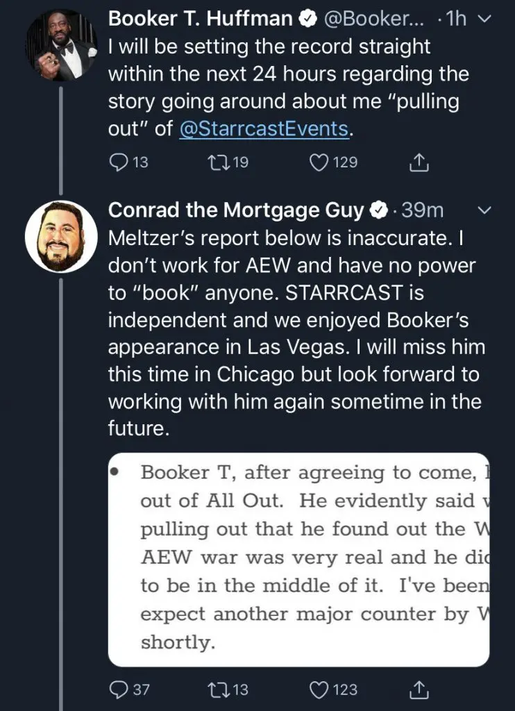 Both Booker T and Starrcast promoter Conrad Thompson clarified the confusion, stating that Booker actually pulled out of Starrcast and that All Out is not affiliated with AEW. They just run in conjunction with one another.