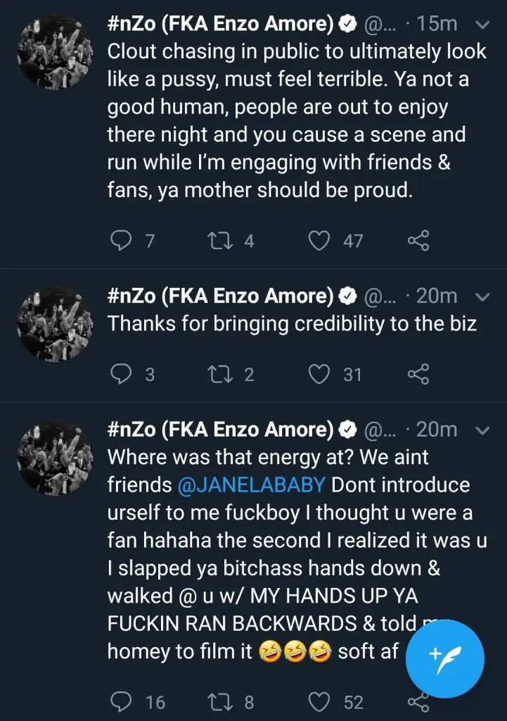 nZo had never really responded to Janela. Then on July 9th nZo and Janela both sent out a series of tweets about an altercation that happens at the Blink/Wayne concert.