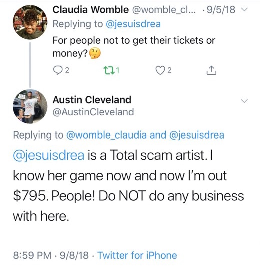 Andrea Hernandez is a scam artist, so if you buy tickets from third party sources online, refrain from doing business with her.
