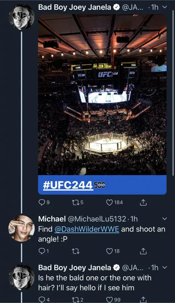 Joey Janela tweeted out that he was at UFC 244, it turns out Dash Wilder is there as well. Dash Wilder is a member of The Revival which is Jim Cornette’s favorite tag team in wrestling. One of Jim Cornette’s least favorite people in wrestling is Joey Janela.