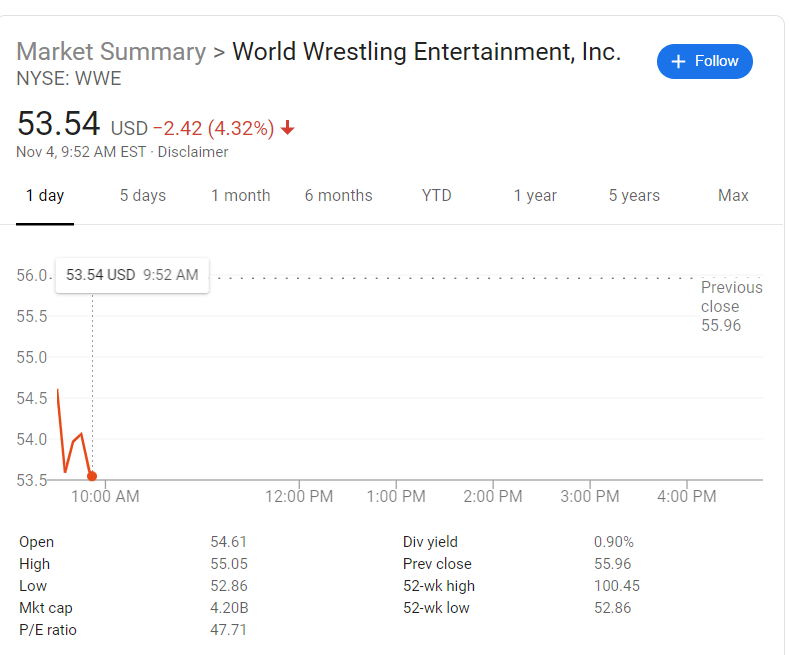 This morning WWE Stock opened at $54.61 a share. By 10 am, price had dropped about $2 a share down to $53.54, with a low of $52.86 at one point. Stocks were down -$2.42, which was a 4.32% drop in two hours.