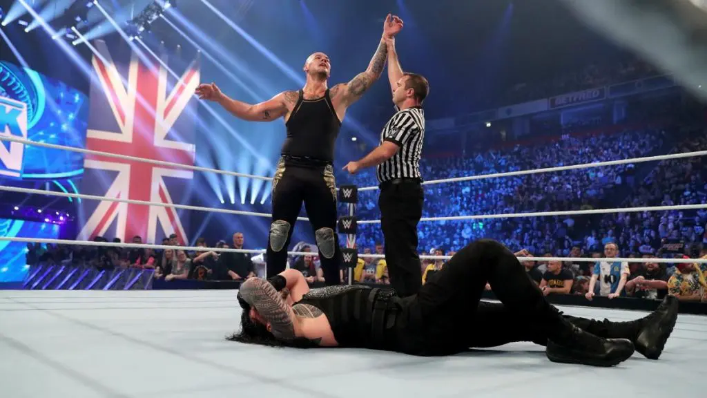 After a great cold open featuring a video package of NXT’s “TakeOver” of the show last week, we transitioned to a King Corbin promo which, considering the show is in the UK, is a guaranteed way to get heat. His promo was intended at Roman Reigns. To be fair, he put him over for a bit by talking about how he beat Leukemia. However, the perception to this promo depends on where you stand from his character. If you really dig it (like i do really), you will find it the right amount of annoying. If not, you will simply consider it bad.