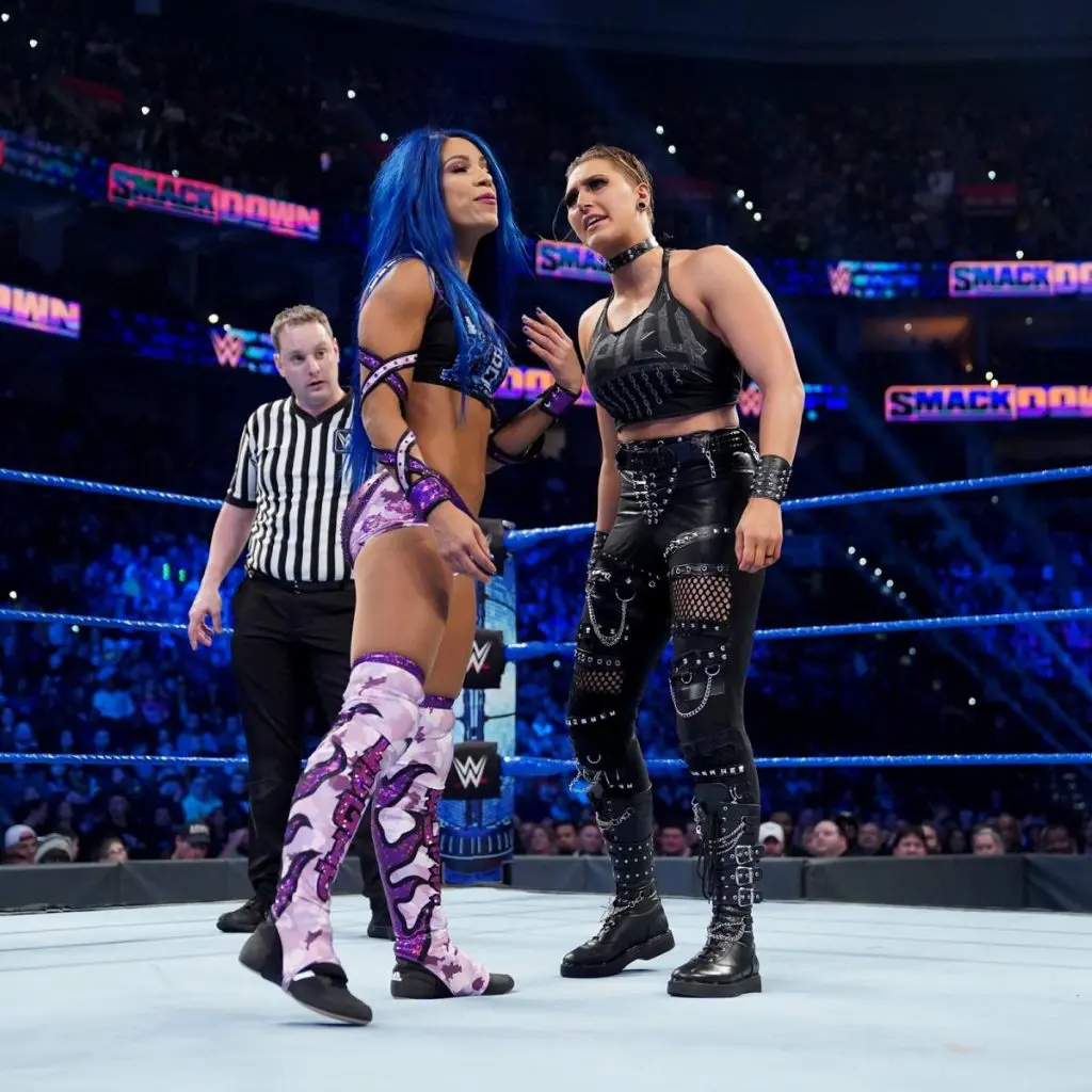 Bayley is backstage with Sasha Banks hyping themselves and their matches at SS.