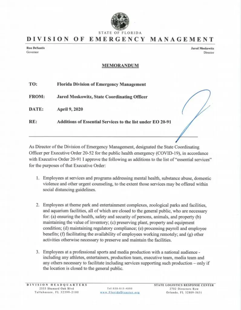 A memo was apparently sent out last Thursday by Desantis declaring that all sports and media were deemed essential business as long as the venue was closed to public. Which you can see below.