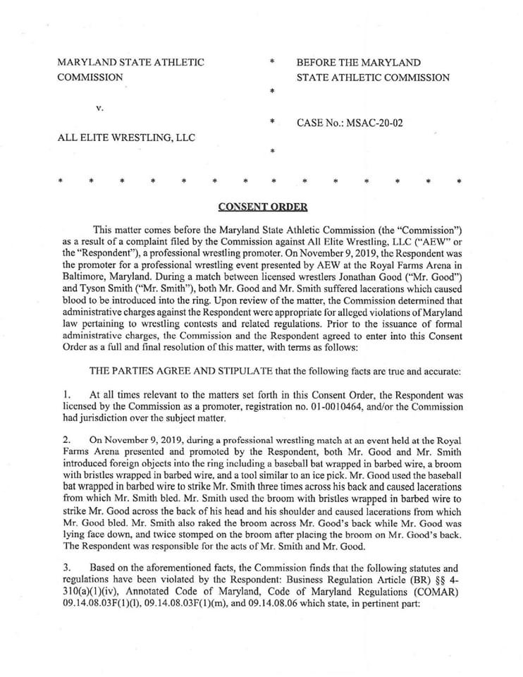 The Maryland State Athletic Commission is fining AEW $10,000 for their unsanctioned match. There also could be harsher penalties if there are repeat offences.