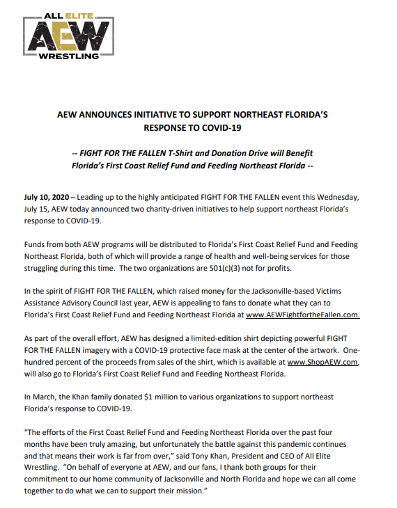 The two organizations are both ran as 501(c)(3) non profit. In the spirit of Fight For The Fallen, which raised money for the Jacksonville-based Victims Assistance Advisory Council last year, AEW is appealing to fans to donate what they can to Florida’s First Coast Relief Fund and Feeding Northeast Florida at www.aewfightforthefallen.com. As part of the overall effort, AEW has designed a limited-edition shirt depicting powerful Fight For The Fallen imagery with a COVID-19 protective face mask at the center of the image.