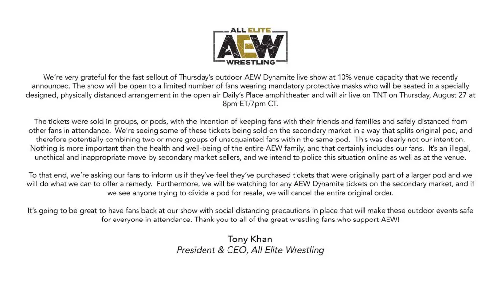 Thank you to all of the great wrestling fans who support AEW! Here is my full statement regarding the illegal and unethical outdoor seating pod splitting on the secondary ticket resale market, a move by predatory online ticket resellers which won’t work and won’t be tolerated:”