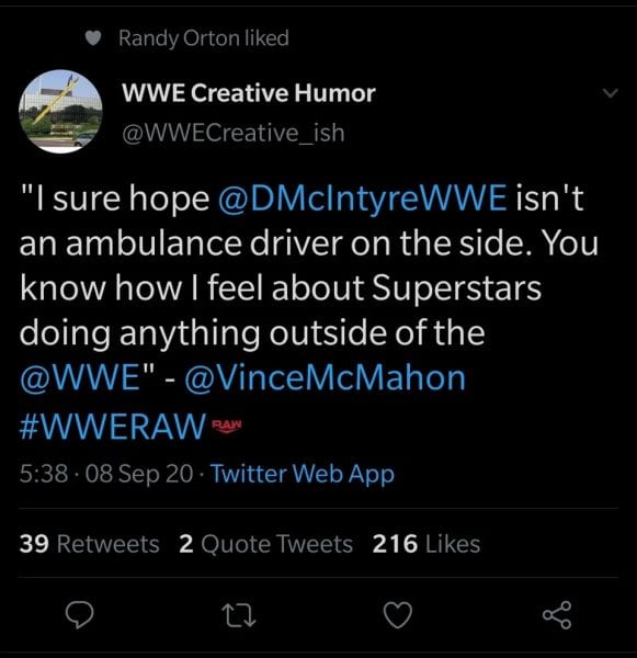 During Monday’s RAW, WWE Champion Drew McIntyre returned to the WWE ThunderDome, commandeering an ambulance to attack Randy Orton. WWE Creative Humor took the opportunity to joke about McIntyre taking another job, a tweet that was liked by Orton himself.