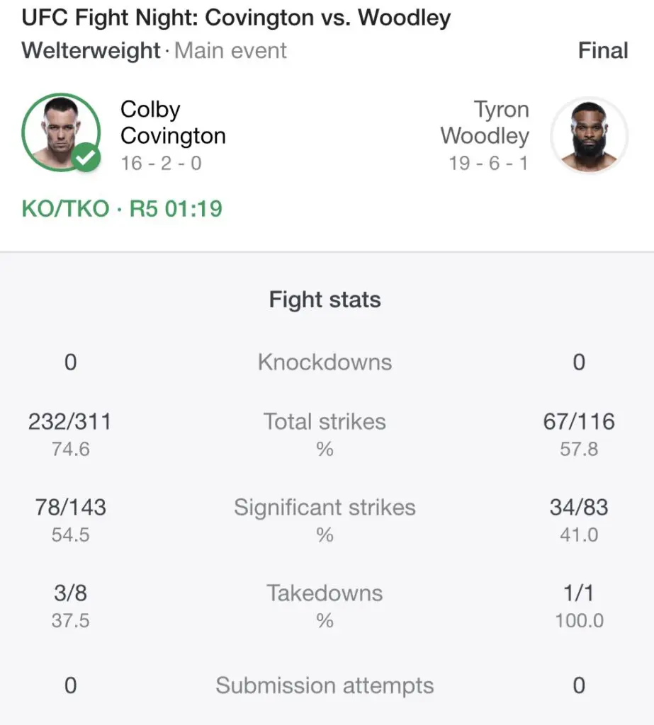 The stoppage was a formality at that point and gave Colby Covington the TKO victory instead of what was sure to be a unanimous decision. Tyron Woodley was a shell of his former self in the ring and was systematically picked apart all night long. Covington landed a ridiculous 74.6% of his strikes, 232/311 overall, with Woodley only landing 67/116 total strikes. This lands Colby right back in the mix for a title shot against Usman or could set up a potential fight with Jorge Masvidal in 2021. Tyron Woodley on the other hand has seen a rapid decline in the ring which even prompted Dana White to say he could consider giving it up. Covington improves to 16-2 and Tyron Woodley falls to 19-6-1.