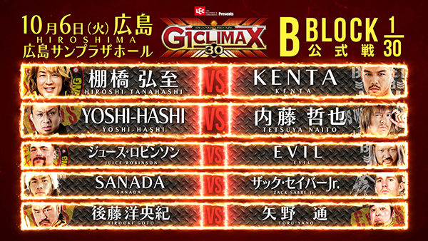 Back on the main island of Honshu as we have 2 straight night of G1 action from Hiroshima. First with B Block action. Also, the first night where Tetsuya Naito doesn’t headline a B Block night. Fortunately, we have a banger in his place.
