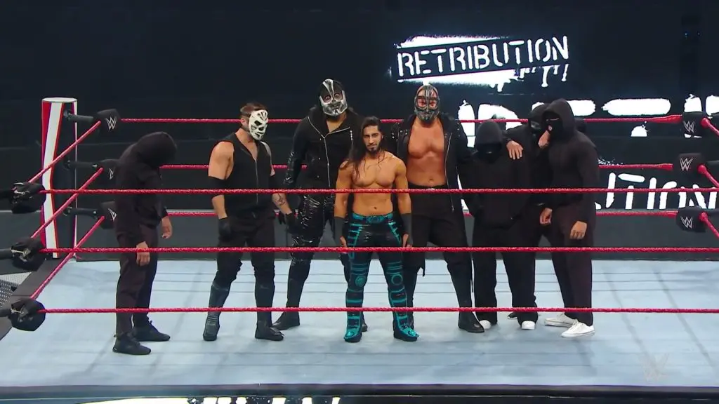 The Street Profits cut a promo backstage letting everyone know they are ready for the main event but The Hurt Business are back to the ring and it’s MVP vs Ali in the first match of his gauntlet type challenge. A few moments into the match all the members of Hurt Business enter the ring but Retribution is back and it seems they have a leader….