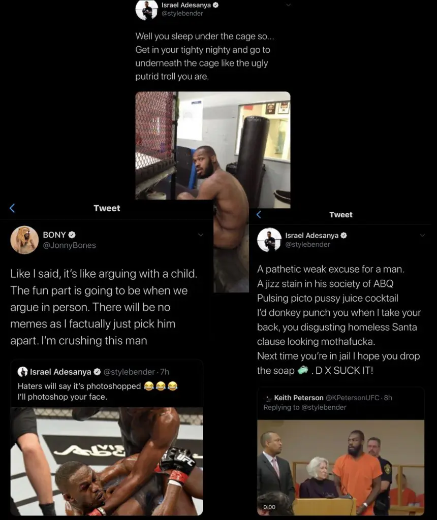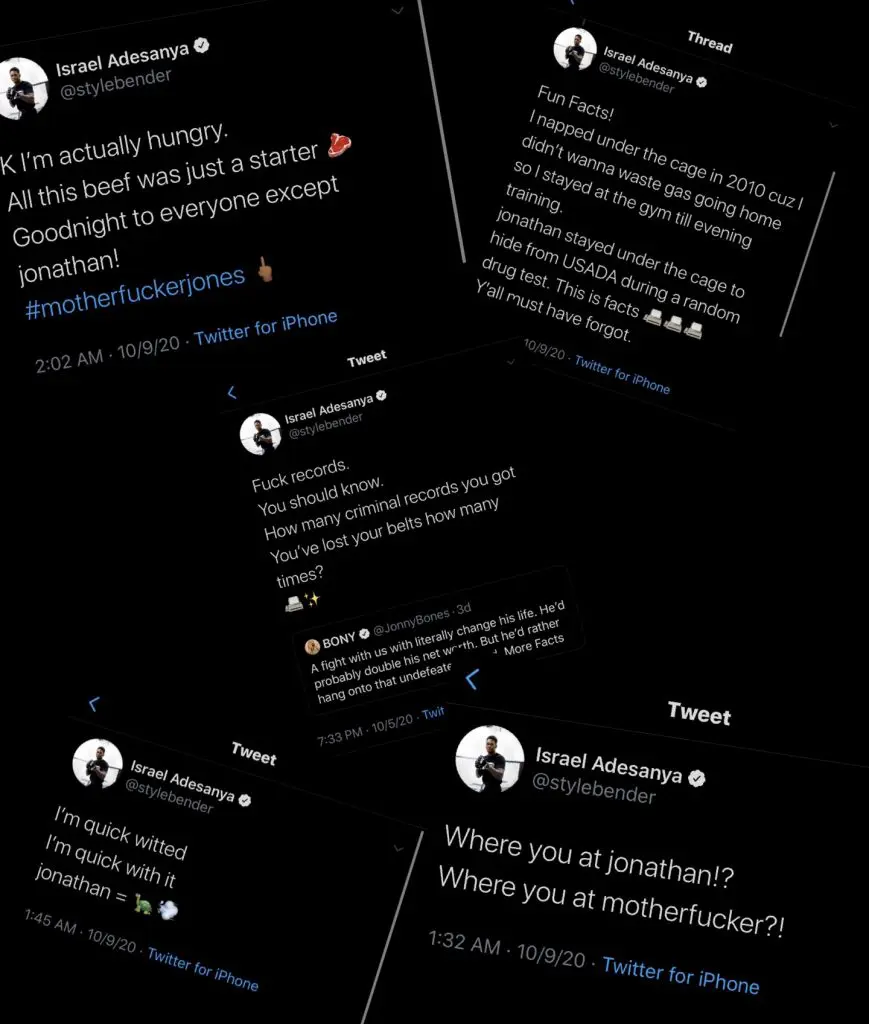 While it’s all fun and games for the viewing public, it’s not doing anything but creating hype for a let down. You have Adesanya attacking Jones from every angle about his past legal problems, mother and failed drug tests; while Jones talks about recent allegations of Israel using steroids in his Costa fight and repeatedly saying Adesanya is just obsessed with him. I believe it’s Israel winning the war of words there are two tweets from Jones that interest me the most