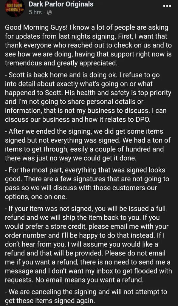 Dark Parlor Originals then issued a statement this morning, saying that Hall made it back home and is doing okay.