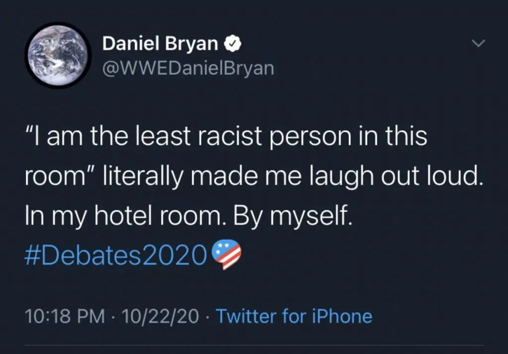 The last of the 2020 Presidential debates took place on Thursday as many people chimed in on Twitter to express their opinion. One of which was WWE Superstar Daniel Bryan,