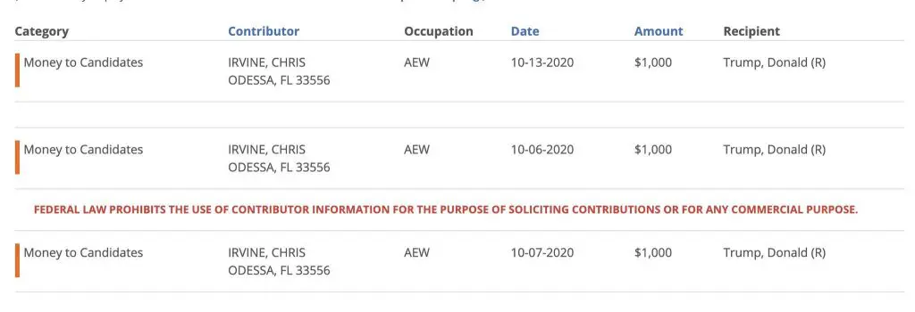 Opensecrets is a website where political contributions are made public and Chris Jericho, real name Chris Irvine, is shown as making $3,000 in contributions to the Trump Campaign.