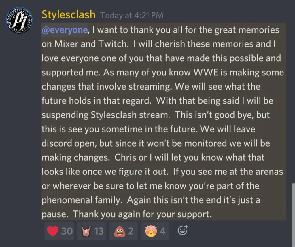 In separate posts today, AJ Styles and Mia Yim have confirmed they will not be streaming on their channels for the immediate future, and the news may have taken them by surprise by just how quick the mandate came. At the time of Yim tweeting the cancellation of her stream, she had been planning on streaming with NXT Superstar Jessamyn Duke tomorrow. Meanwhile, AJ Styles confirmed WWE was responsible for “upcoming changes that involve streaming” via Discord.