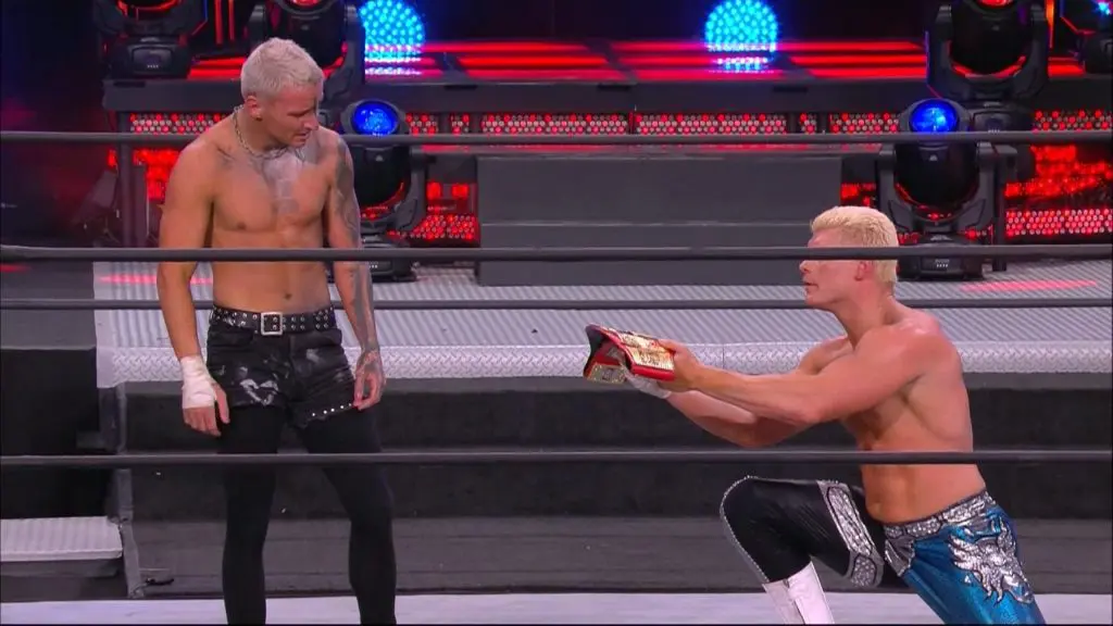 After the match Cody presented Darby with the belt acknowledging him as the new face of TNT.