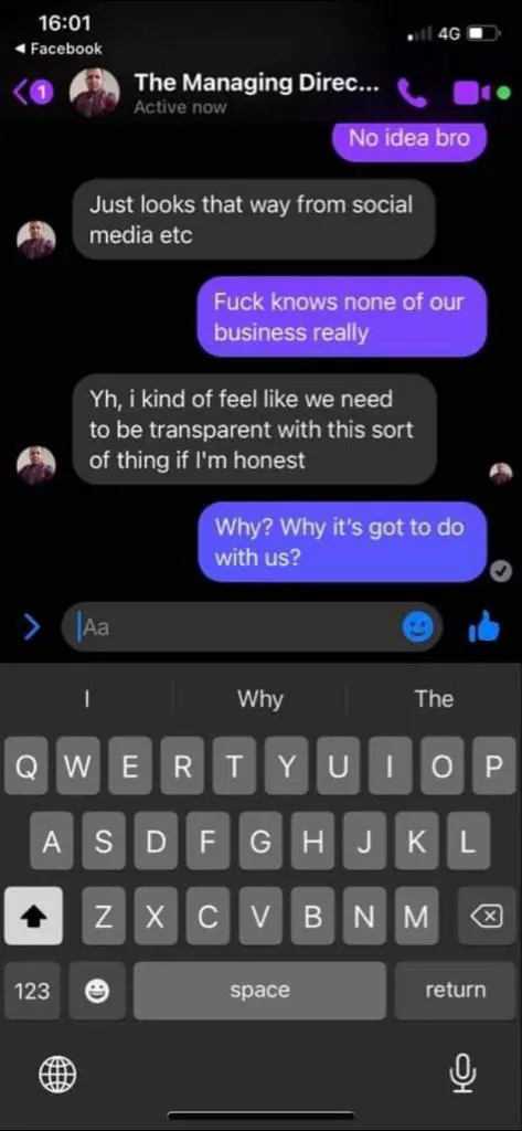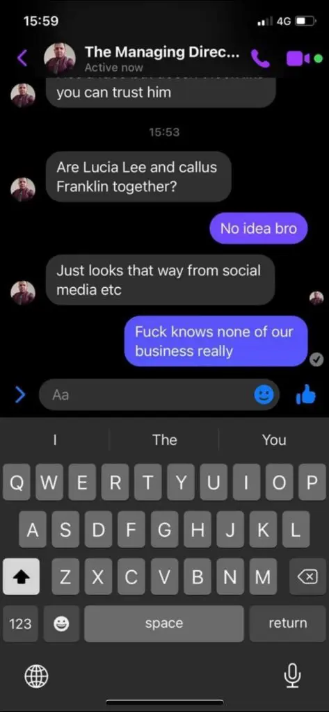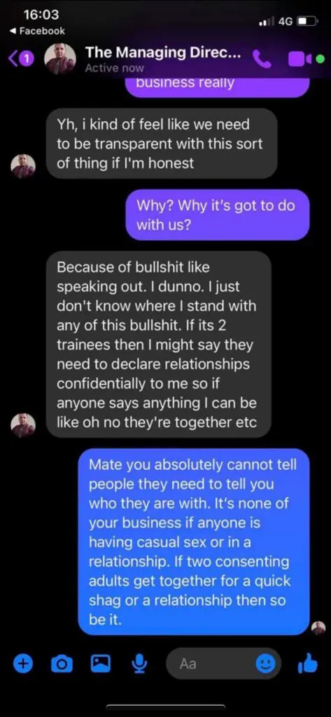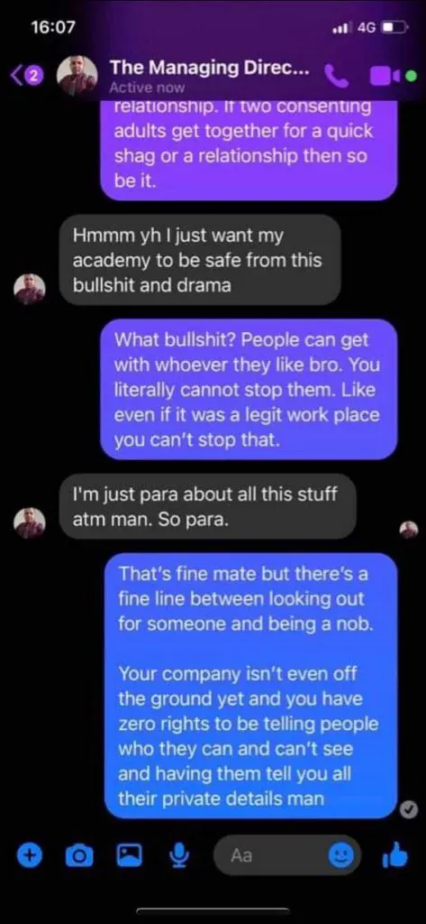 Lee’s initial accusation revealed that Kenny was asking around about her relationship, the screenshots below revealing that he was asking about it to other people feeling that female talent had to disclose their relationships to avoid “speaking out bulls*it.”