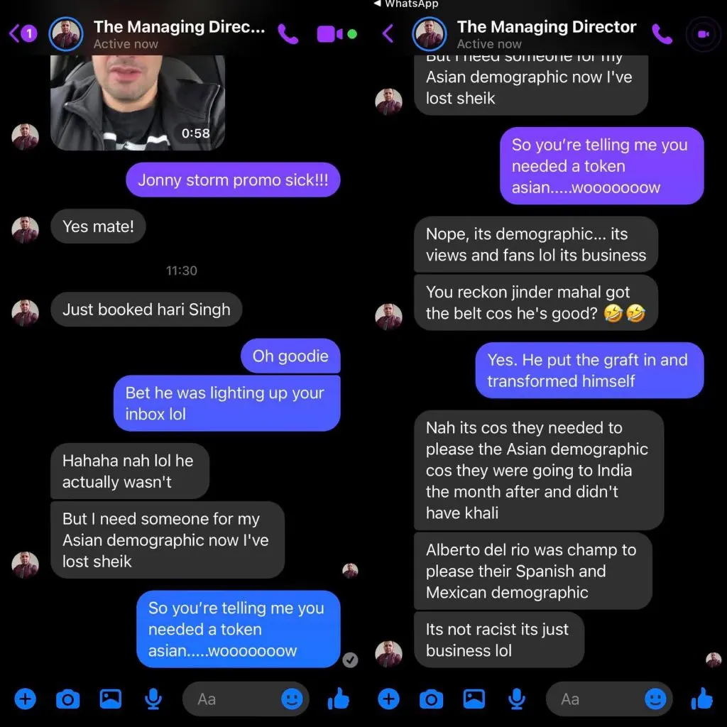 Kenny then continued to add to the accusations, revealing that she had found out Kenny was only booking independent talent Hari Singh to appeal to an Asian demographic. His messages then reveal he believes the WWE only put the title on Jinder Mahal to appeal to a demographic and not because of merit.